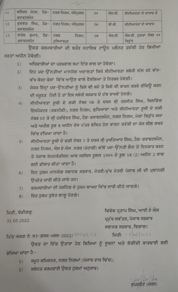 अमृतसर,2 जून (राजन): पंजाब सरकार के लोकल बॉडी विभाग द्वारा पंजाब की अलग-अलग नगर निगमों में तैनात 13 बिल्डिंग इंस्पेक्टरों को पदोन्नति देकर असिस्टेंट टाउन प्लानर ( एटीपी ) नियुक्त कर दिया है।