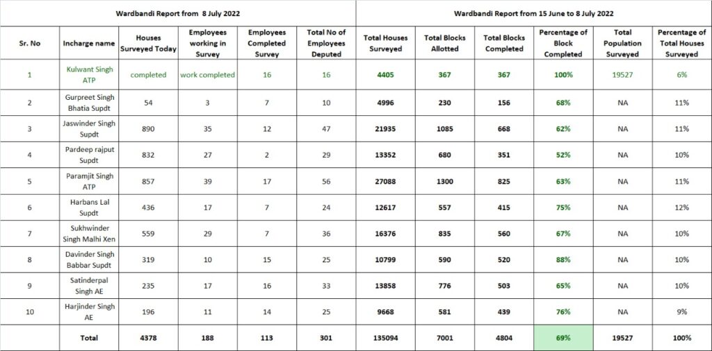 अमृतसर, 8 जुलाई (राजन):नगर निगम द्वारा शहर की वार्ड बंदी को लेकर घरों का सर्वे शुरू किया गया। निगम की टीमों द्वारा 22 दिनों में 135094 घरों का सर्वे पूरा कर लिया है। आज 4378 घरों का सर्वे हुआ है। पंजाब सरकार के लोकल बॉडी विभाग द्वारा नगर निगम को 25 जुलाई तक सर्वे पूरा करने के आदेश दिए हुए हैं।