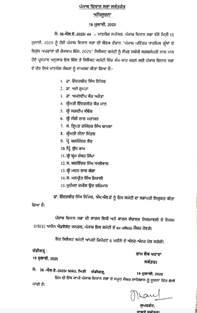 अमृतसर,19 जुलाई:पंजाब विधानसभा ने “पंजाब पवित्र धार्मिक ग्रंथ 2025 ” पर कार्य करने के लिए 15 सदस्यीय विशेष कमेटी का गठन किया है। यह कमेटी बीते दिनों विधानसभा में पेश किए गए.बिल को मजबूत और बेहतर बनाने के लिए इस कमेटी का गठन किया गया है। गौरतलब है कि पंजाब विधानसभा में स्पीकर ने 6 महीने में इस बिल को दोबारा से सदन में पेश करने की बात कही है। इसके चेयरमैन डॉ. इंदरबीर सिंह निज्जर को नियुक्त किया गया है। कमेटी में डॉ. इंद्रबीर सिंह निज्जर के अलावा डॉ. अजय गुप्ता, डॉ. अमनदीप कौर अरोड़ा, इंदरजीत कौर मान, जगदीश कंबोज, जंगी लाल महाजन, तृप्त रजिंदर सिंह बाजवा, नीना मित्तल, प्रो. बलजिंदर कौर, प्रिंसिपल बुध राम, ब्रह्म शंकर जिंपा, बलविंदर सिंह धालीवाल, मदनलाल बग्गा, मनप्रीत सिंह इयाली और मोहम्मद जमील उर रहमान को रखा गया है।