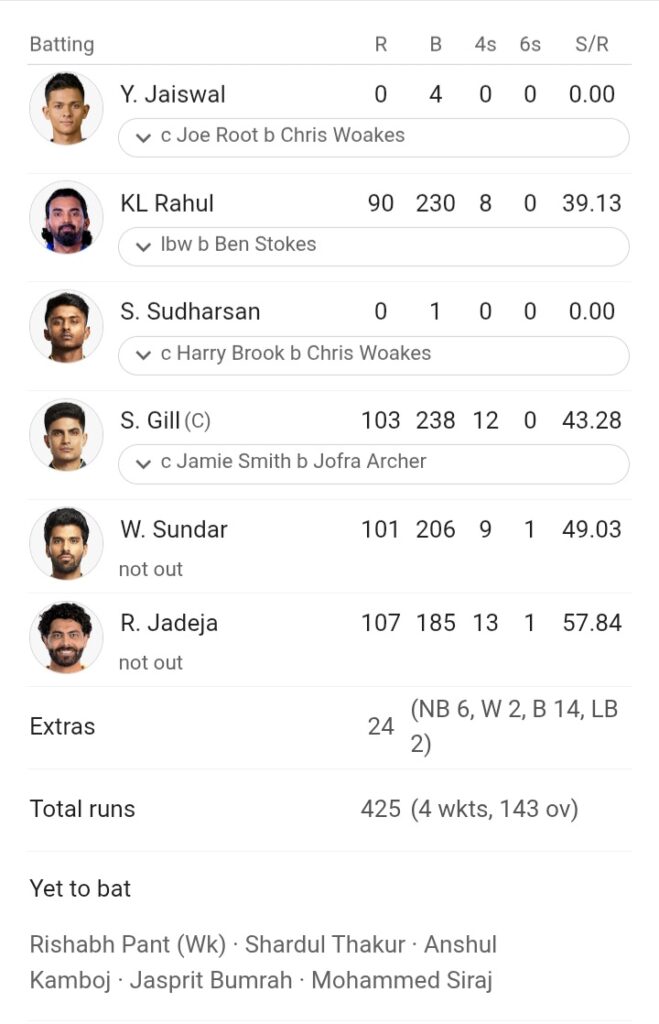 अमृतसर,27 जुलाई:टीम इंडिया ने दूसरी पारी में 143 ओवर बैटिंग कर मैनचेस्टर टेस्ट को हार से ड्रॉ में बदल दिया। टीम से शुभमन गिल,रवींद्र जडेजा और वॉशिंगटन सुंदर ने शतक लगाया। वहीं केएल राहुल ने 90 रन की पारी खेली। ओल्ड ट्रैफर्ड में पहली पारी में भारत ने 358 और इंग्लैंड ने 669 रन बनाए थे। भारत ने दूसरी पारी में 4 विकेट के नुकसान पर 425 रन बनाए और मुकाबला ड्रॉ करा दिया।एंडरसन तेंदुलकर ट्रॉफी का चौथा टेस्ट ड्रॉ होने के बावजूद इंग्लैंड के पास सीरीज में 2-1 की बढ़त है। सीरीज का पांचवां और आखिरी टेस्ट 31 जुलाई से लंदन के द ओवल