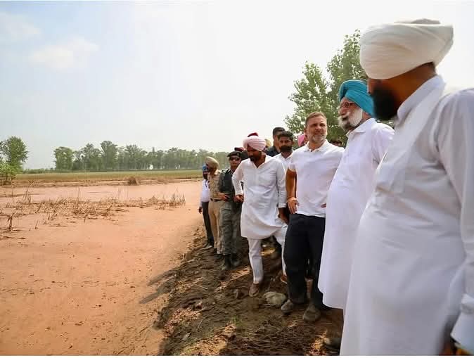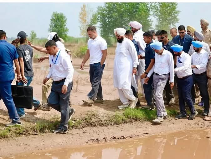 एयरपोर्ट पहुंचे। सबसे पहले वह अमृतसर के घोनेवाल गांव गए। यहां उन्होंने बाढ़ से प्रभावित लोगों से मिलकर डूबी हुई फसलों और टूटे हुए घरों का जायजा लिया। उन्होंने गुरुद्वारा बीड़ बाबा बुड्ढा साहिब में मत्था भी टेका। इसके बाद, राहुल गांधी गुरदासपुर के गुरचक्क गांव पहुंचे, जहां उन्होंने उस स्थान का दौरा किया जहां बांध टूटने से खेत और घर जलमग्न हो गए थे। उन्होंने किसानों से मुलाकात की और फिर ट्रैक्टर पर सवार होकर आधा किलोमीटर दूर खड़ी अपनी गाड़ी तक पहुंचे।