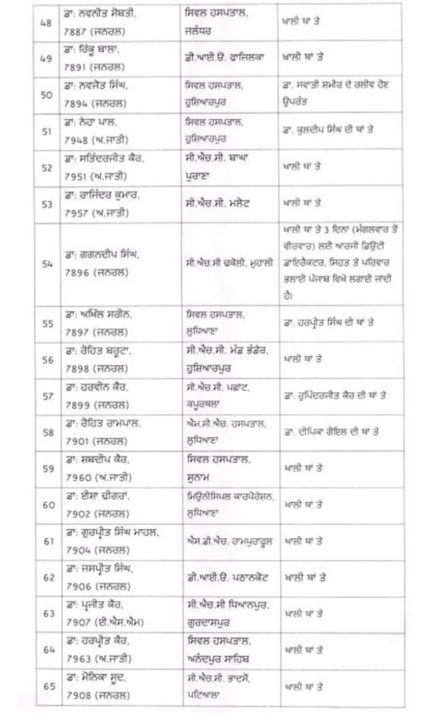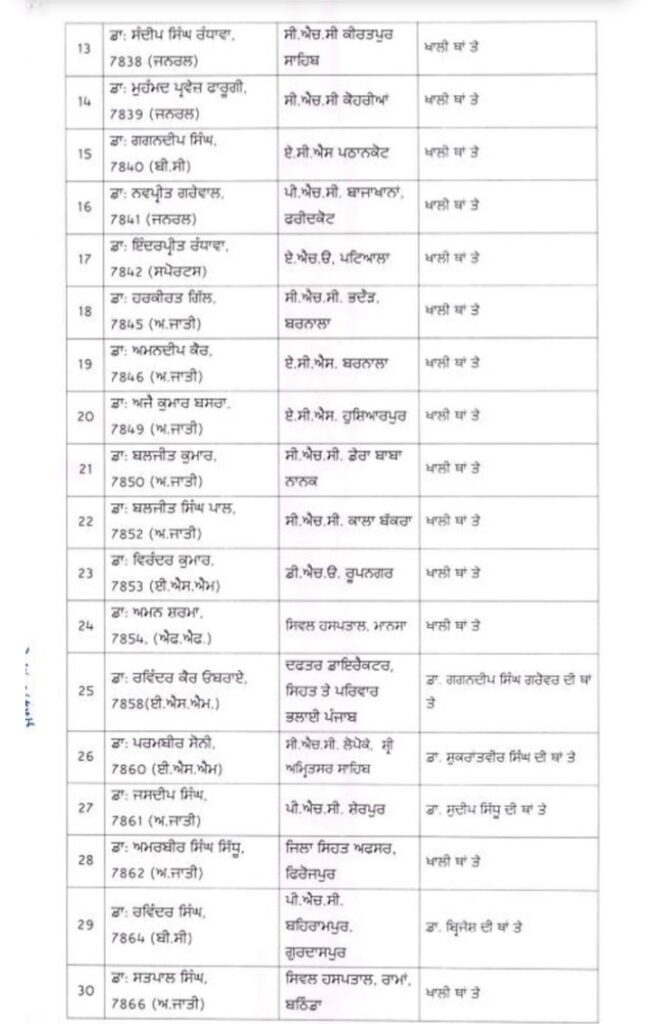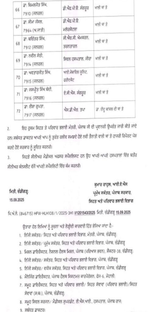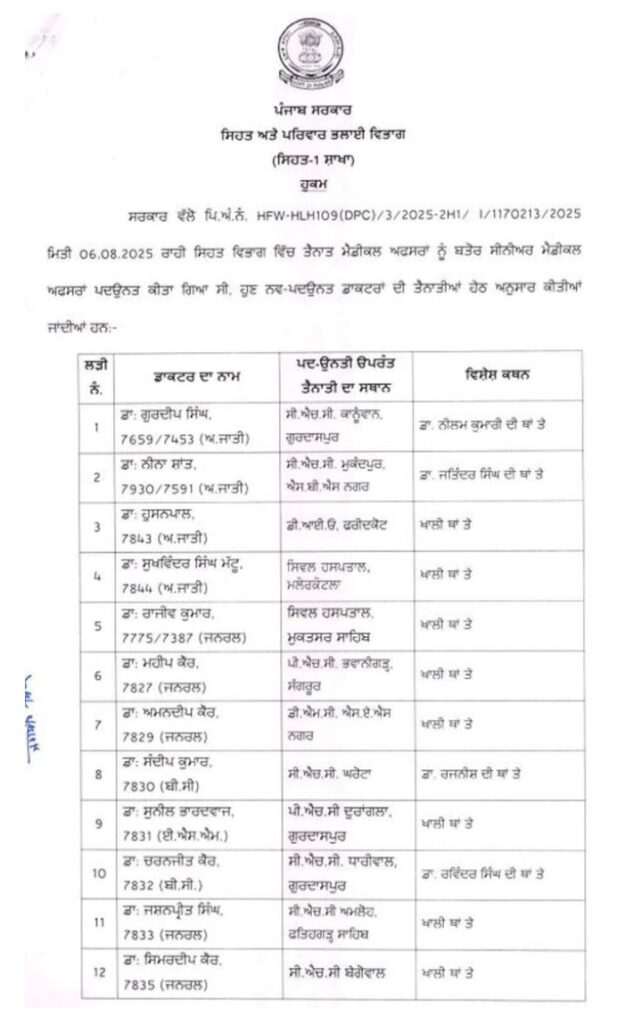 अमृतसर,16 सितंबर:पंजाब सरकार ने स्वास्थ्य विभाग में 72 चिकित्सा अधिकारियों को पदोन्नत कर वरिष्ठ चिकित्सा अधिकारी बनाया गया है। पदोन्नत वरिष्ठ चिकित्सा अधिकारियों की तैनाती के आदेश भी जारी कर दिए गए हैं।