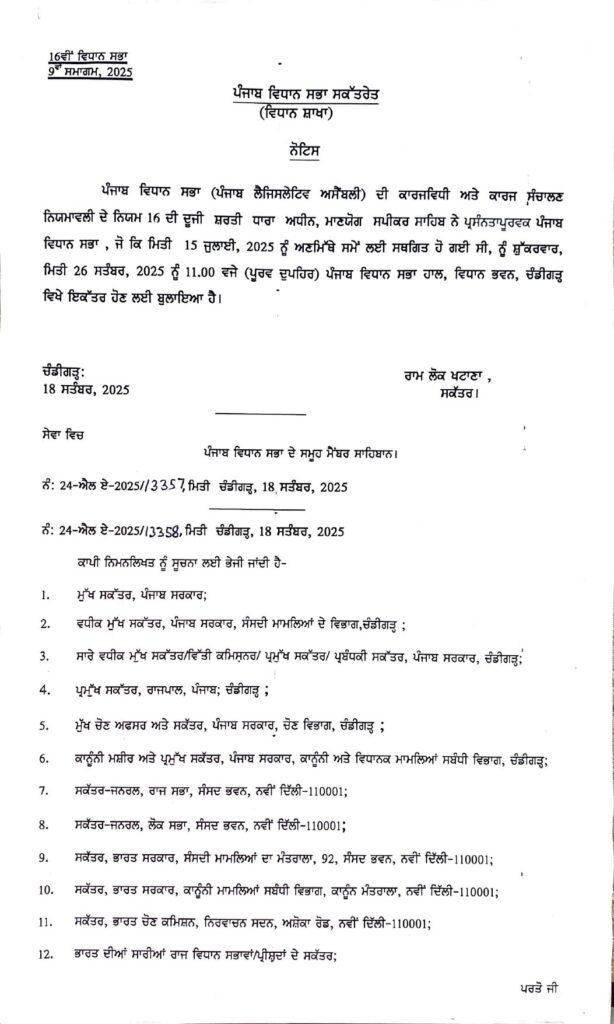 अमृतसर, 18 सितंबर: पंजाब के मुख्यमंत्री भगवंत सिंह मान ने ट्वीट करके कहा है कि पंजाब में बाढ़ से हुई तबाही से जुड़े कुछ नियमों में लोक-पक्षीय संशोधन करने तथा मुआवज़े से संबंधित कुछ नए क़ानूनों को मंज़ूरी देने के लिए पंजाब विधानसभा का विशेष सत्र 26 सितंबर से 29 सितंबर तक बुलाया जाता है।
