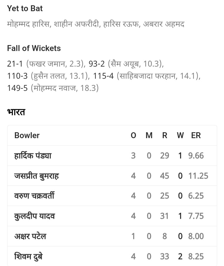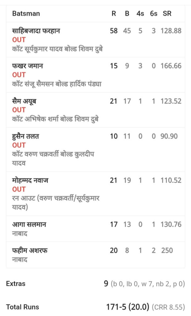एशिया कप के सुपर-4 मुकाबले में पाकिस्तान की क्रिकेट टीम प्ले भारत को जीत के लिए रनो का टारगेट दिया। पाकिस्तान की टीम ने 20 ओवर में 5 विकेट खोकर 171 बनाए। पाकिस्तान के बल्लेबाज फरहान ने बनाए 58 रन,सईम अयूब और मोहम्मद नवाज ने 21-21 रन बनाए। भारत के लिए शिवम दुबे ने 2 विकेट लिए । हार्दिक पंड्या और कुलदीप यादव को 1-1 विकेट मिला।