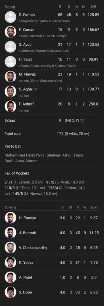 अमृतसर,21 सितंबर (राजन गुप्ता):दुबई इंटरनेशनल स्टेडियम में एशिया कप के सुपर-4 मुकाबले में भारतीय क्रिकेट टीम ने पाकिस्तान को पराजित किया। भारतीय क्रिकेट टीम 6 विकेट से विजय हुई। एशिया कप 2025 में पाकिस्तान पर भारत की लगातार दूसरी जीत है।भारत ने टॉस जीतकर गेंदबाजी करने का निर्णय लिया।पाकिस्तान की टीम ने 20 ओवर में 5 विकेट खोकर 171 बनाए। पाकिस्तान के बल्लेबाज फरहान ने बनाए 58 रन,सईम अयूब और मोहम्मद नवाज ने 21-21 रन बनाए। भारत के लिए शिवम दुबे ने 2 विकेट लिए । हार्दिक पंड्या और कुलदीप यादव को 1-1 विकेट मिला।