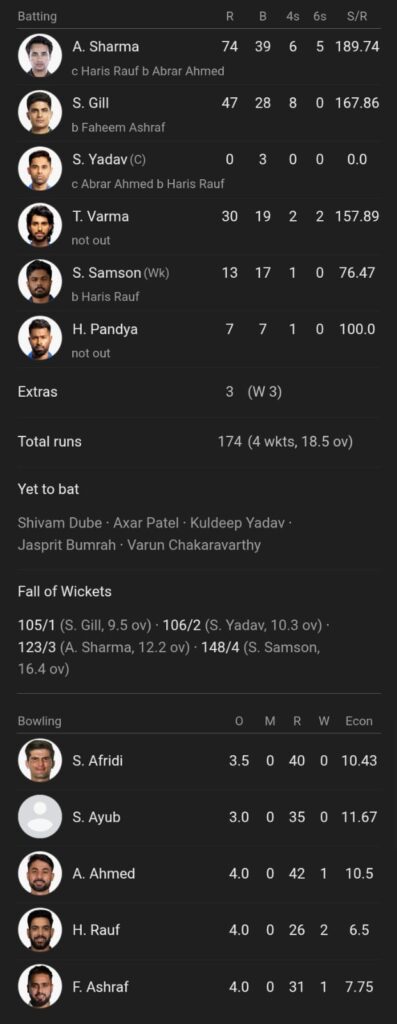 जबाब में भारत के स्लामी बल्लेबाज अभिषेक शर्मा और शुभम गिल शानदार बल्लेबाजी करके भारत को विजय बनाया । दोनों बल्लेबाजों ने 105 रनो की साझेदारी निभाई । शुभम गिल ने 47 रन बनाएं। अभिषेक शर्मा ने 39 गेंद में चार चौको और पांच छक्को की मदद से 74 रन बनाए। तिलक वर्मा ने नाबाद 30 रन, संजू सैमसन ने 13 रन और हार्दिक पांड्या ने नाबाद 7 रन अर्जित किए। भारत की टीम ने 18.5 ओवर में 4 विकेट खोकर 174 रन बनाकर विजय हासिल की।