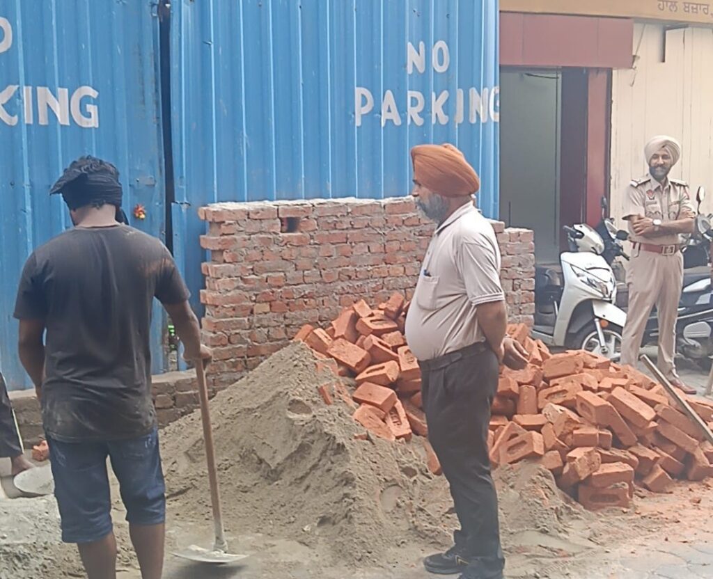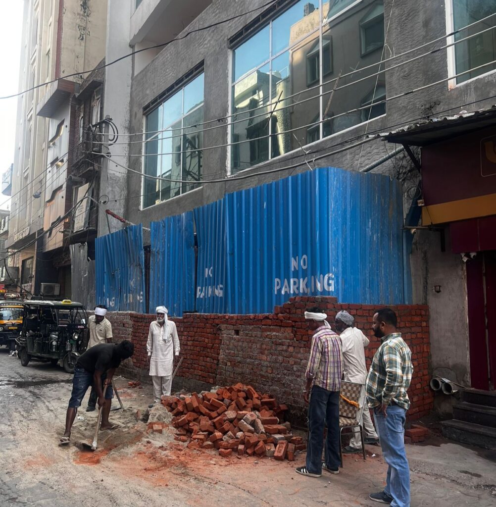 होटल के बाहर नगर निगम के अधिकारी दीवार करवाते हुए।