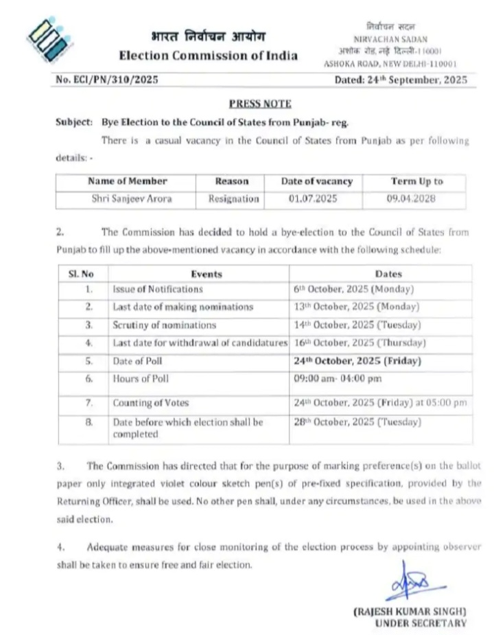 पंजाब में खाली राज्यसभा सीट पर चुनाव 24 अक्टूबर को: चुनाव आयोग ने नोटिफिकेशन किया जारी