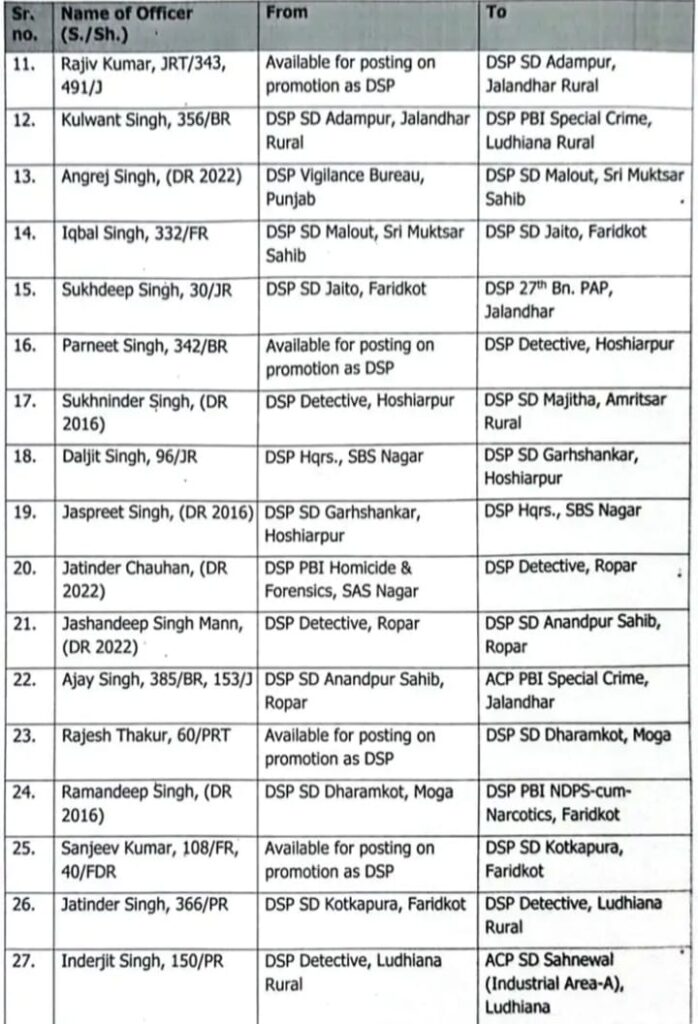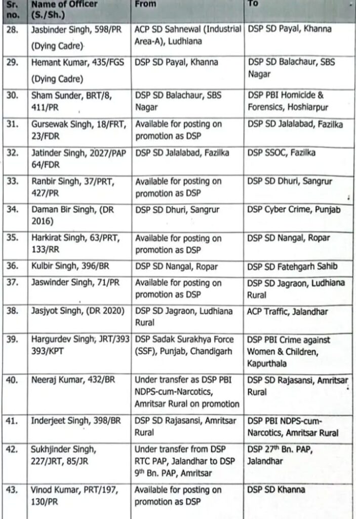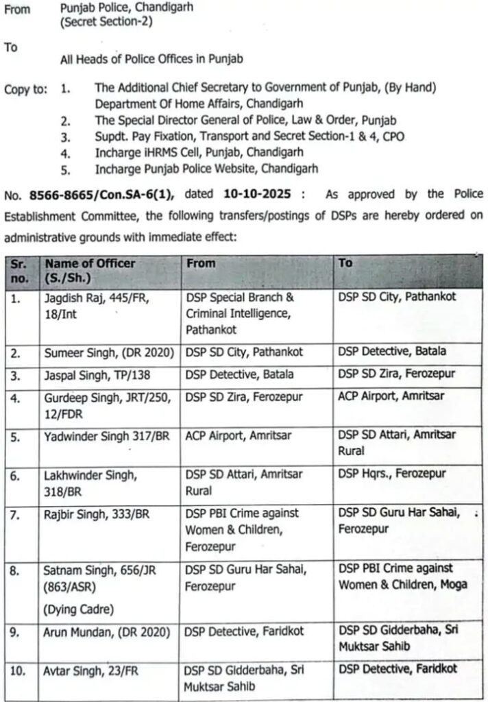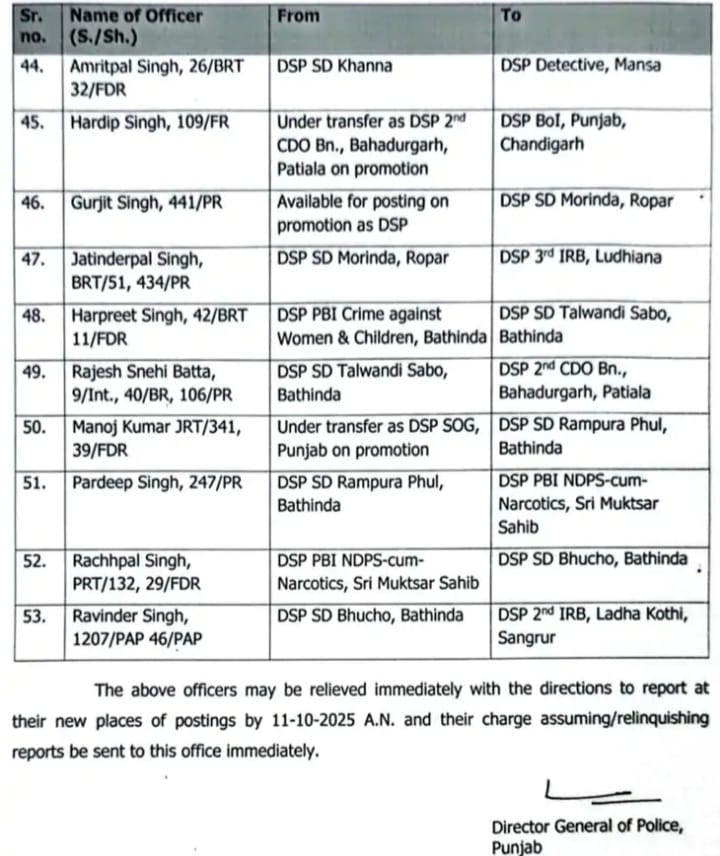 अमृतसर,10 अक्टूबर :पंजाब के डीजीपी गौरव यादव ने प्रदेश के 53 डीएसपी का तबादला कर दिया है। इन सभी को तुरंत अपनी नई जगह पर जॉइन करने को कहा गया है। इनमें गुरदीप सिंह को एसीपी अमृतसर एयरपोर्ट, यादविंदर सिंह को डीएसपी अटारी लगाया गया है।