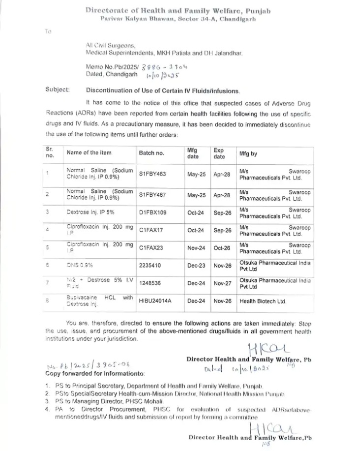 अमृतसर,12 अक्टूबर:पंजाब के स्वास्थ्य विभाग ने पंजाब में 8 दवाओं की खरीद और इस्तेमाल पर रोक लगा दी है।  स्वास्थ्य एवं परिवार कल्याण विभाग द्वारा जारी नोटिफिकेशन के अनुसार मरीजों में इन दवाओं के प्रयोग के बाद रिएक्शन जैसी समस्याएं देखी गईं हैं। इस कारण विभाग द्वारा  इन दवाओं की खरीद और इस्तेमाल पर रोक लगाने का फैसला किया है। जानकारी के अनुसार नॉर्मल सलाइन (Normal Saline, डेक्सट्रोज इंजेक्शन (Dextrose Inj.), सिपरोफ्लोक्सेसिन इंजेक्शन (Ciprofloxacin Inj.), डी.एन.एस. 0.9% (DNS 0.9%), एन/2 + डेक्सट्रोज 5% IV फ्लूइड (N/2 + Destrose 5% I.V Fluid), बुपीवाकेन (Bupivacaine) HCL with Dextrose Inj. को बैन किया गया है।