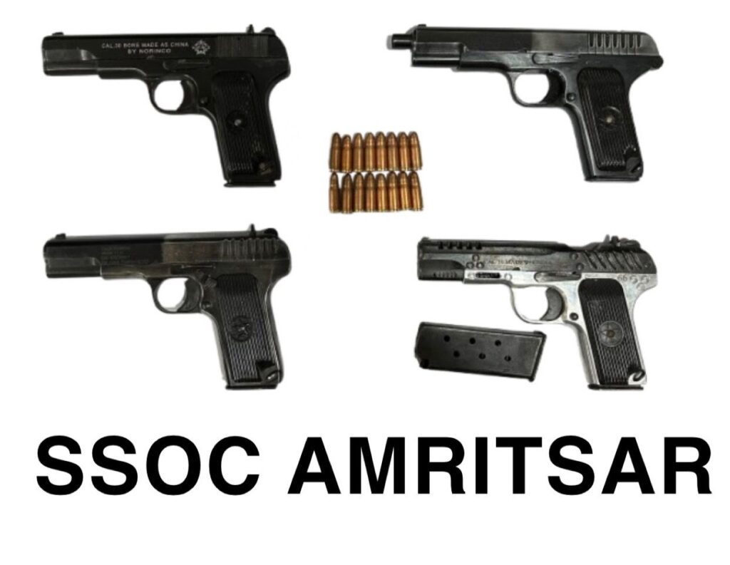 अमृतसर, 22 अक्टूबर (राजन): पंजाब पुलिस के डीजीपी गौरव यादव द्वारा दी गई जानकारी के अनुसार राज्य विशेष अभियान प्रकोष्ठ (SSOC), अमृतसर ने एक बड़ी सफलता हासिल करते हुए, एक सीमा पार तस्करी नेटवर्क का भंडाफोड़ किया और चार गुर्गों को गिरफ्तार किया। जिन में जुगराज सिंह उर्फ चिरी, कुलबीर सिंह उर्फ नन्नू उर्फ कालू, अर्शदीप सिंह और नछत्तर सिंह, सभी निवासी तरनतारन और उनके पास से 30 बोर की चार अत्याधुनिक पिस्तौलें और कारतूस बरामद किए।