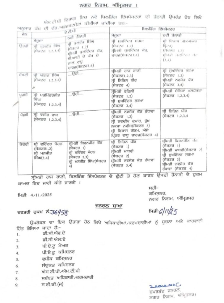 अमृतसर, 6 नवंबर (राजन): नगर निगम कमिश्नर बिक्रमजीत सिंह शेरगिल द्वारा एमटीपी विभाग के अधिकारियों के तबादले किए गए हैं। जारी किए गए आदेशों के अनुसार उत्तरी जोन में एटीपी कुलवंत सिंह के साथ बिल्डिंग इंस्पेक्टर कुलविंदर कौर को एटीपी का अतिरिक्त चार्ज दिया गया है। इसी तरह से केंद्रीय जोन एटीपी वरिंदर मोहन, एटीपी मनजीत सिंह के साथ बिल्डिंग इंस्पेक्टर किरनजीत कौर को एटीपी का अतिरिक्त चार्ज दिया गया है। इसी तरह से बिल्डिंग इंस्पेक्टरो के भी तबादले किए गए हैं।