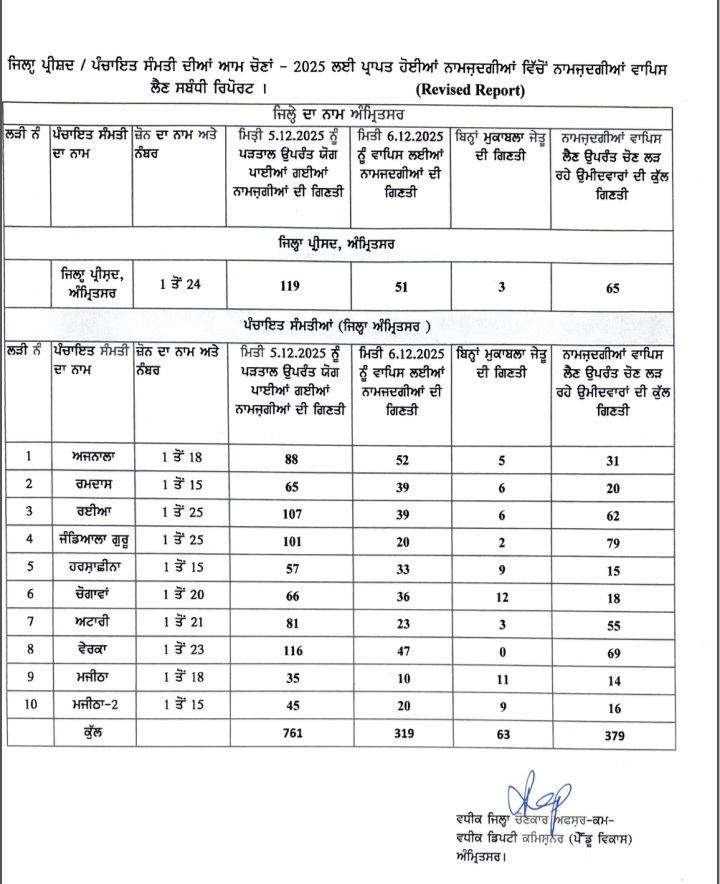 अमृतसर,6 दिसंबर (राजन): जिला अमृतसर में 14 दिसंबर को होने वाले पंचायत समिति और जिला परिषद चुनावों में कुल 444 उम्मीदवार चुनावी मैदान में बचे हुए हैं। जिला परिषद अमृतसर चुनाव में 5 दिसंबर को जांच पड़ताल के उपरांत 119 उम्मीदवार रह गए थे। आज 51 उम्मीदवारों ने अपने नामांकन वापस लेने के उपरांत 65 उम्मीदवार ही मैदान में रह गए हैं। इनमें से 3 उम्मीदवार निर्विरोध चुने गए हैं। इसी तरह से जिला अमृतसर 10 पंचायत समिति चुनाव में 5 दिसंबर को जांच पड़ताल के उपरांत 761 उम्मीदवार रह गए थे। आज 319 उम्मीदवारों ने अपने-अपने नामांकन वापस ले लिए है और निर्विरोध 63 उम्मीदवार चुने गए हैं। इस तरह से 379 उम्मीदवार मैदान में रह गए हैं।