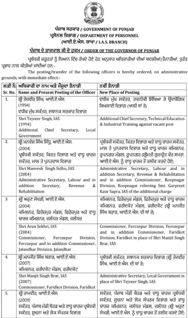 अमृतसर,11 दिसंबर : पंजाब सरकार ने 7 आईएएस और एक पीसीएस अधिकारियों के तबादले करने के आदेश जारी किए हैं। जारी आदेशों के अनुसार आईएएस अधिकारी मनजीत सिंह बराड़ को एडमिनिस्ट्रेटिव सेक्रेट्री लोकल गवर्नमेंट नियुक्त किया गया है। लोकल गवर्नमेंट के एडिशनल चीफ सेक्रेटरी तेजवीर सिंह को टेक्निकल एजुकेशन एंड इंडस्ट्रियल ट्रेनिंग के एडिशनल चीफ सेक्रेटरी की जिम्मेदारी दी गई। वहीं, लेबर एंड इन एडिशन सेक्रेटरी मनवेश सिंह सिंधु को रूपनगर डिवीजन के रिहैबिलिटेशन कमिश्नर की जिम्मेदारी सौंपी गई है।