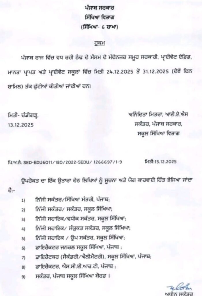 पंजाब सरकार के स्कूल शिक्षा विभाग की सचिव अनिंदिता मित्रा के मुताबिक यह आदेश सभी सरकारी स्कूलों के साथ प्राइवेट एडेड, मान्यता प्राप्त और प्राइवेट स्कूलों पर भी लागू होंगे। स्कूल 1 जनवरी को दोबारा खुलेंगे। शिक्षा विभाग की तरफ से आदेश की कॉपी सभी स्कूलों, एसईआरटी और पंजाब स्कूल शिक्षा विभाग को भेज दी है।वही, उक्त आदेश का सख्ती से पालन किया जाएगा।