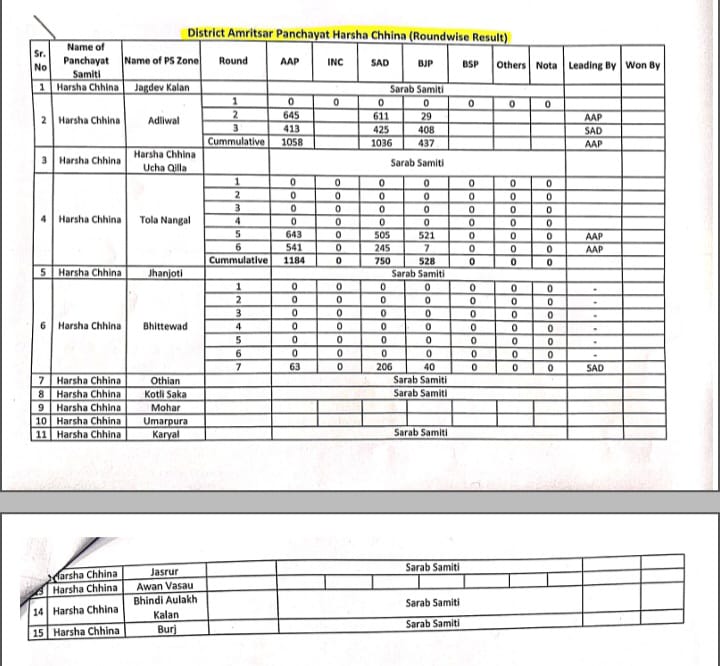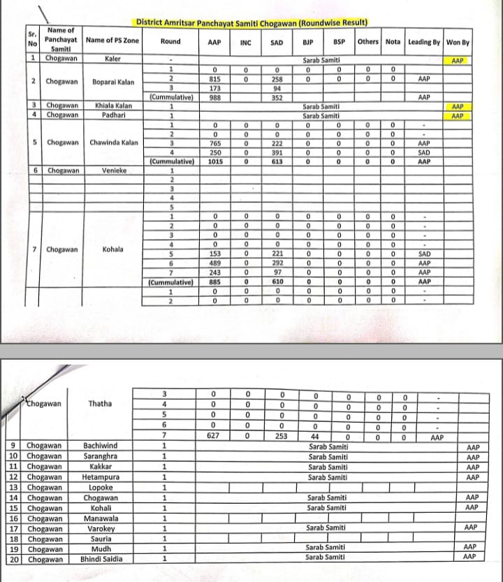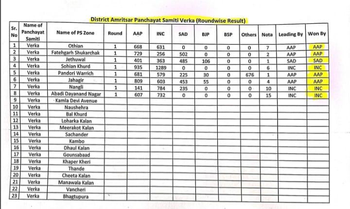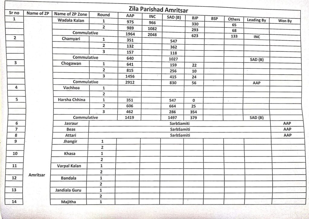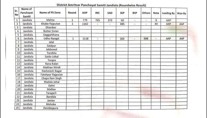 अमृतसर, 17 दिसंबर: जिला अमृतसर में पंचायत समिति और जिला परिषद चुनावों में आम आदमी पार्टी के उम्मीदवार आगे चल रहे हैं और कुछ विजय भी हो गए हैं। पंचायत समिति हर्षा छिना, चौगावा, वेरका, राजा सांसी, अजनाला में आम आदमी पार्टी के उम्मीदवार आगे चल रहे हैं।