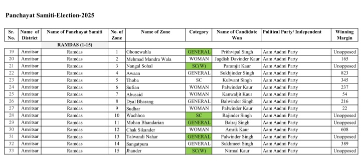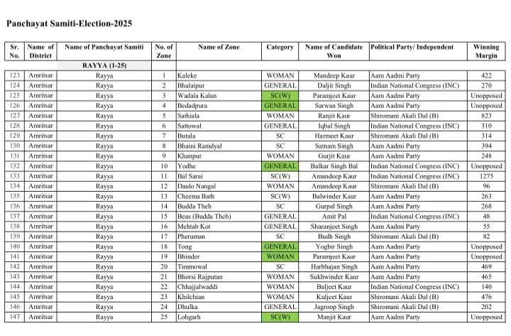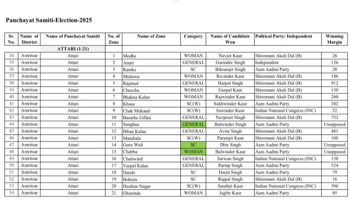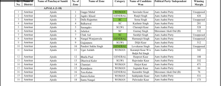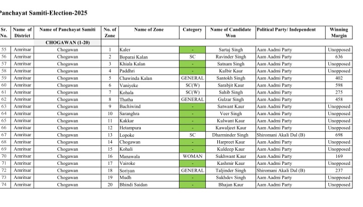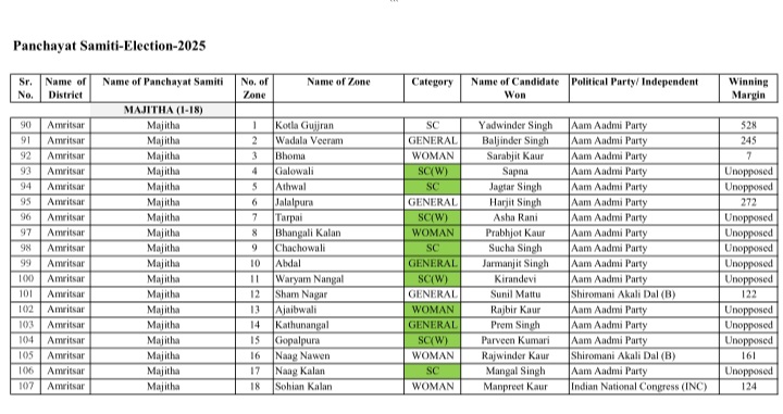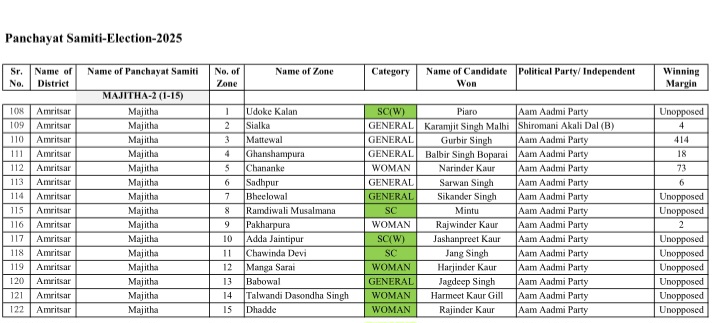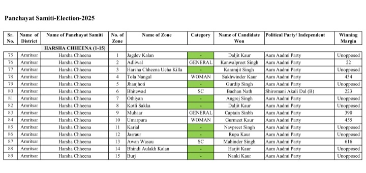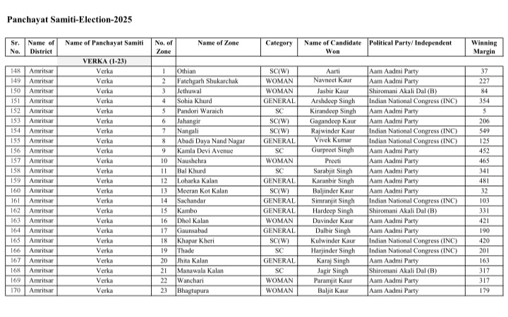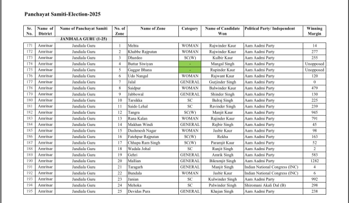 अमृतसर,18 दिसंबर: जिला अमृतसर में ब्लॉक समिति चुनाव में आम आदमी पार्टी ने बाजी मारी है। जिला अमृतसर में 195 सीटों पर ब्लॉक समिति चुनाव हुए। सभी 195 सीटों पर चुनाव के नतीजे घोषित हो चुके हैं। सभी 195 सीटों पर विस्तार पूर्वक नतीजे देखने के लिए निमित्त लिखित जारी सभी ब्लॉक समिति के विवरण इस प्रकार हैं।