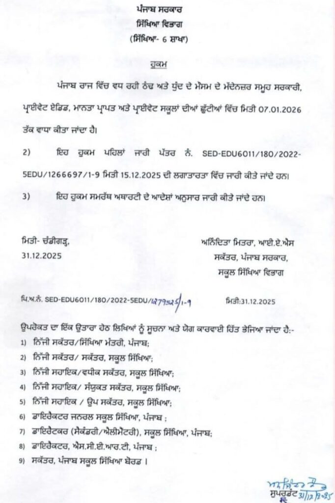 अमृतसर, 31 दिसंबर:पंजाब में बढ़ती सर्दी और कोहरे के कारण सभी स्कूलों में छुट्टियां बढ़ गई है। अब सभी प्राइवेट, सरकारी, एडिड और. मान्यता प्राप्त स्कूल 8 जनवरी को खुलेंगे। यह ऐलान आज पंजाब सरकार के सचिव स्कूल शिक्षा विभाग ने किया है।प्रदेश में लगातार बढ़ रहे कोहरे को देखते हुए बच्चों और स्टाफ की सेहत और सुरक्षा को ध्यान में रखते हुए स्कूलों में 7 जनवरी तक छुट्टियां की जा रही है। 8 जनवरी को पहले की तरह स्कूल खुलेंगे।