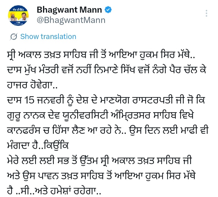 अमृतसर,5 जनवरी:सीएम भगवंत मान ने एक्स पर कहा- श्री अकाल तख्त साहिब से आया हुक्म सिर-मत्थे, दास मुख्यमंत्री नहीं बल्कि एक विनम्र सिख की तरह नंगे पैर चलकर हाजिर होगा। 15 जनवरी को राष्ट्रपति गुरुनानक देव यूनिवर्सिटी अमृतसर में कान्फ्रेंस में हिस्सा लेने के लिए आ रही हैं, उस दिन के लिए माफी मांगता हूं। मेरे लिए सबसे ऊंचा श्री अकाल तख्त साहिब जी और पावन तख्त साहिब से हुक्म आया है। यह हुक्म सिर मत्थे है, था और रहेगा।