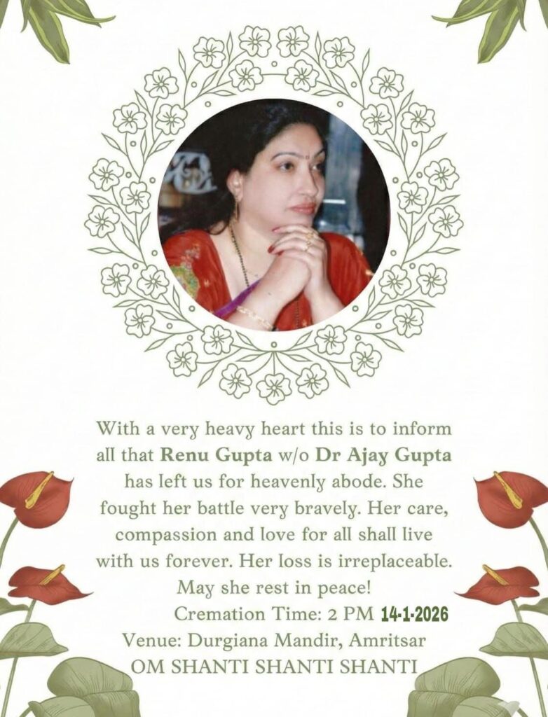 अमृतसर,14 जनवरी :अमृतसर के केंद्रीय विधानसभा सीट से आम आदमी पार्टी के विधायक डॉ. अजय गुप्ता की पत्नी रेणु गुप्ता का निधन हो गया है। रेनू गुप्ता का अंतिम संस्कार आज दोपहर 2:00 बजे हाथी गेट स्थित दुर्गियाना  शिवपुरी में होगा। 56 वर्षीय रेणु गुप्ता ने लंबी बीमारी के बाद मंगलवार रात करीब 10:30 बजे अंतिम सांस ली। जानकारी के अनुसार, रेणु गुप्ता लीवर कैंसर से पीड़ित थीं।बीते कई दिनों से उनकी हालत गंभीर बनी हुई थी और उन्हें अमृतसर के ग्रीन एवेन्यू स्थित एक निजी अस्पताल के आईसीयू में वेंटिलेटर पर रखा गया था। डॉक्टरों की तमाम कोशिशों के बावजूद उन्हें बचाया नहीं जा सका।रेणु गुप्ता अपने पीछे भरा-पूरा परिवार छोड़ गई हैं। उनके दो बेटे और एक बेटी हैं।