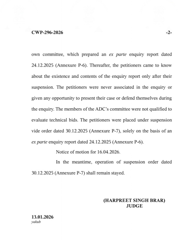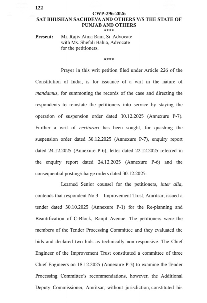 अमृतसर, 14 जनवरी (राजन):पंजाब एंड हरियाणा हाईकोर्ट ने अमृतसर इंप्रूवमेंट ट्रस्ट के 52.80 करोड़ के टैंडर में गड़बड़ी पर सस्पेंड 7 अफसरों की सस्पेंशन पर स्टे लगा दिया है। अब ट्रस्ट के सातों अधिकारी हाई कोर्ट से स्टे मिलने के कारण फिलहाल इंप्रूवमेंट ट्रस्ट अमृतसर में कार्य करेंगे।मामले की अगली सुनवाई 16 अप्रैल 2026 को होगी। पंजाब एंड हरियाणा हाई कोर्ट के जस्टिस ने टेंडर में कथित गड़बड़ी आरोप पर सख्त आर्डर जारी किए हैं। इस टेंडर में शामिल सीगल इंडिया कंपनी द्वारा चीफ सेक्रेट्री पंजाब सरकार को शिकायत करने पर चीफ सेक्रेटरी ने इसकी जांच के लिए डिप्टी कमिश्नर अमृतसर को निर्देश दिए थे। डीसी अमृतसर ने एडीसी डवलपमेंट शहरी के नेतृत्व में 4 मेंबरी जांच कमेटी बनाई थी। इस कमेटी में टेंडर की टेक्निकल इवेलुएशन करने के लिए कोई भी तकनीकी अधिकारी शामिल नहीं था।इस कमेटी में एडीसी चेयरपर्सन, एक्सईएन पीडब्ल्यूडी एक्सईएन वाटर सप्लाई एंड सेनिटेशन और डीसीएफए मेंबर थे। मगर कमेटी में टेंडर को ई-वैल्यूट करने को कोई टेक्निकल अफसर (इंजीनियर) नहीं था।