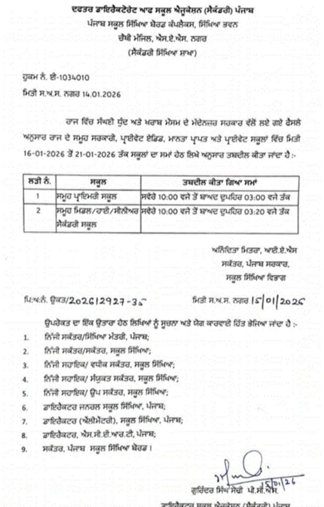 पंजाब के स्कूल शिक्षा विभाग के सचिव द्वारा जारी आदेश के अनुसार, धुंध और खराब मौसम के चलते सरकार द्वारा लिए गए फैसले के मुताबिक सभी सरकारी, प्राईवेट एडिड, मान्यता प्राप्त तथा प्राईवेट स्कूल के समय में बदलाव किया गया है।