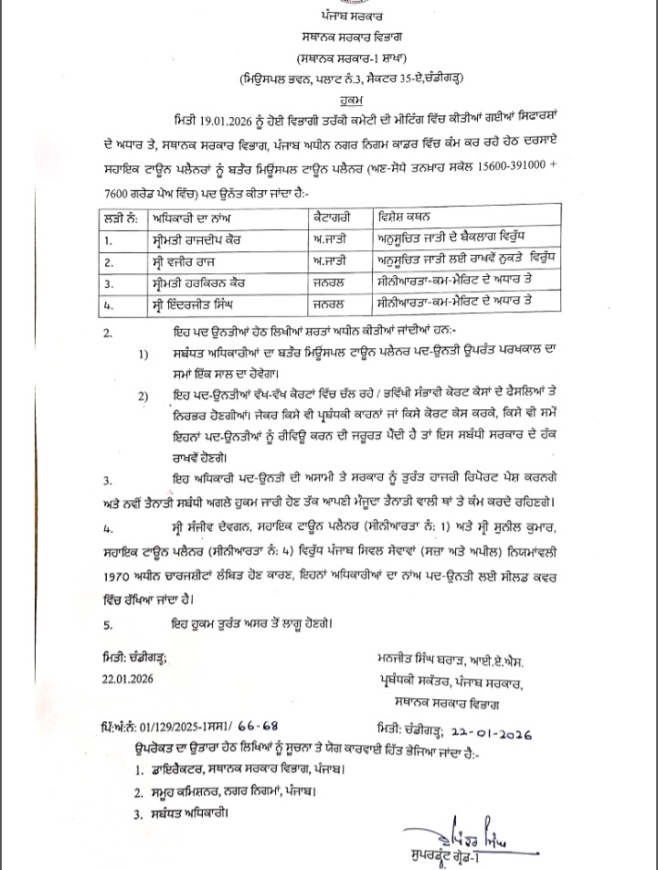 अमृतसर, 22 जनवरी: पंजाब सरकार के लोकल बॉडी विभाग के प्रबंधकीय सचिव ने आदेश जारी करके पंजाब की नगर निगमो के चार एटीपी को तरक्की देकर एमटीपी नियुक्त कर दिया है। तरक्की पाकर एमटीपी नियुक्त हुए राजदीप कौर, वजीर राज, हरकिरण कौर और इंद्रजीत सिंह के नाम शामिल है।