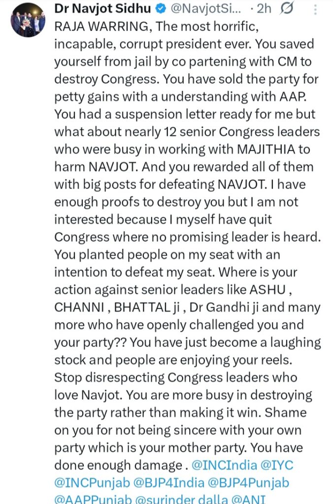 डॉ नवजोत कौर सिद्धू ने एक्स पर लिखा