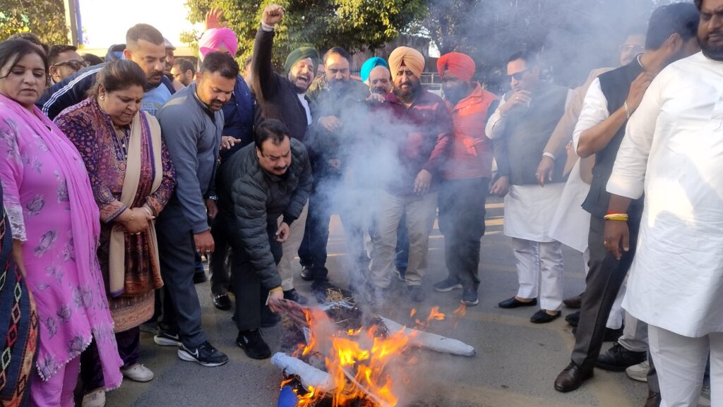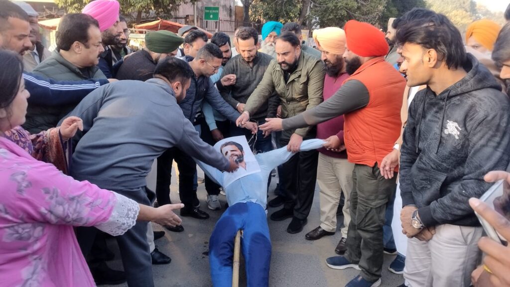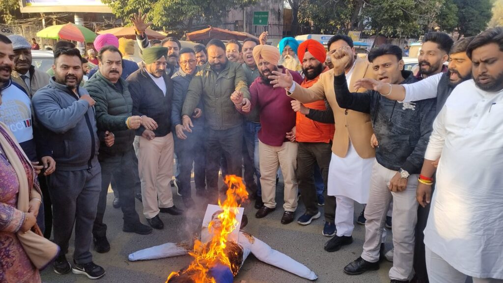 अमृतसर, 4 फरवरी(राजन) : भाजपा के केन्द्रीय रेल राज्य मंत्री रवनीत सिंह बिट्टू को लोकसभा में कांग्रेस नेता प्रतिपक्ष राहुल गाँधी द्वारा गद्दार कहे जाने को लेकर भाजपा कार्यकर्ताओं ने अपना रोष व्यक्त करते हुए भाजपा जिलाध्यक्ष हरविंदर सिंह संधू के नेतृत्व में हाथी गेट चौक में राहुल गाँधी के विरुद्ध जमकर नारेबाजी करते हुए पुतला फूंक कर प्रदर्शन किया। इस अवसर पर सुखमिंदर सिंह पिंटू, डॉ. राम चावला, कुमार अमित, अजयबीर पाल सिंह रंधावा आदि उपस्थित थे।
