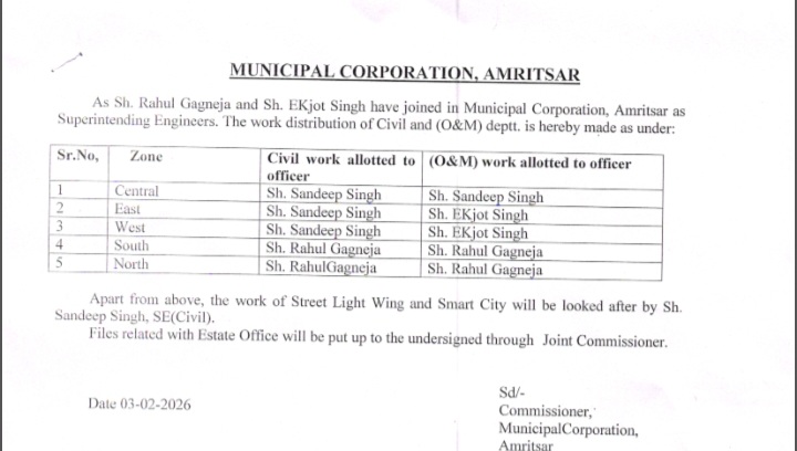 अमृतसर,4 फरवरी (राजन): नगर निगम अमृतसर में पहले एक ही निगराण इंजीनियर संदीप सिंह कार्य कर रहे थे। पंजाब सरकार के लोकल बॉडी विभाग द्वारा निगराण इंजीनियर राहुल गगनेजा और निगराण इंजीनियर एकजोत सिंह को नगर निगम अमृतसर का अतिरिक्त चार्ज दे दिया है। निगम कमिश्नर बिक्रमजीत सिंह शेरगिल द्वारा अब तीनों निगराण इंजीनियरो में कार्य बांट दिए हैं। संदीप सिंह को केंद्रीय जोन, ईस्ट जोन और वेस्ट जोन का सिविल विंग का चार्ज दिया है। राहुल गोगनेजा को साउथ जोन और नॉर्थ जोन सिविल विंग का चार्ज दिया गया है। इसी तरह से एकजोत सिंह को ईस्ट जोन और वेस्ट जोन का ओ एंड एम सेल का चार्ज दिया है। जारी आदेशों के अनुसार संदीप सिंह केंद्रीय जोन का ओ एंड एम सेल तथा राहुल गोगनेजा को साउथ और नॉर्थ जोन का ओ एंड एम सेल का चार्ज दिया है। निगराण इंजीनियर संदीप सिंह स्ट्रीट लाइट विभाग और स्मार्ट सिटी प्रोजेक्ट का भी कार्य करेंगे।