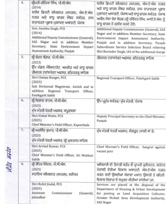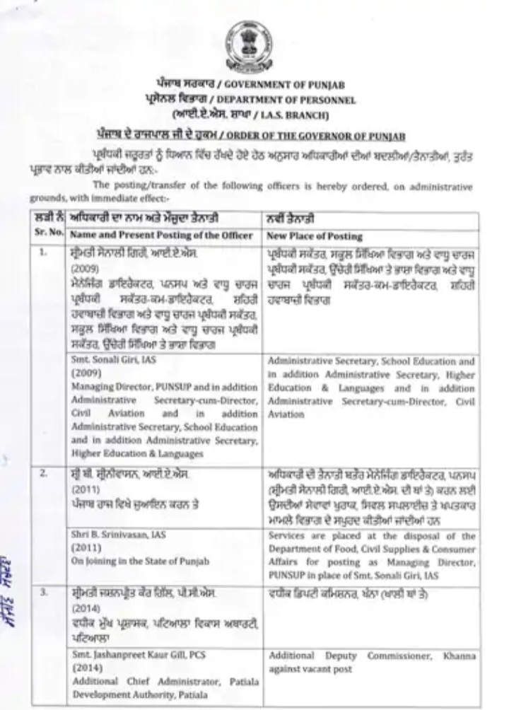 अमृतसर, 13 फरवरी: पंजाब सरकार ने दो आईएएस और चार पीसीएस अधिकारियों के तबादले किए हैं। जारी आदेशों के अनुसार आईएएस अधिकारी सोनाली गिरी को प्रबंधकीय सेक्रेटरी स्कूल एजुकेशन , एडिशनल प्रबंधकीय सेक्रेटरी हायर एजुकेशन और भाषा विभाग, इसके साथ-साथ एडिशनल सेक्रेटरी कम डायरेक्टर एविएशन विभाग नियुक्त किया गया है।