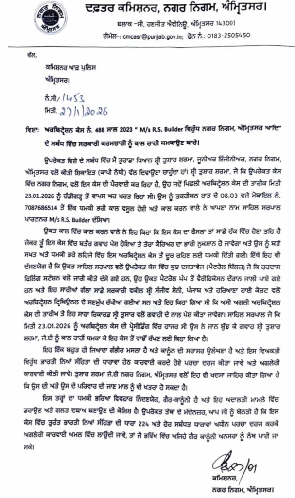 अमृतसर, 15 फरवरी: नगर निगम अमृतसर के जे ई को एक ठेकेदार द्वारा धमकियां दी जा रही है। उक्त ठेकेदार द्वारा माननीय हाईकोर्ट में नगर निगम अमृतसर के विरुद्ध आर्बिट्रेशन केस दायर किया हुआ है। इस केस की पिछली तारीख पर नगर निगम जे ई तुषार शर्मा कोर्ट में पेश हुए थे। तुषार शर्मा जब कोर्ट में पेश होकर वापस अमृतसर आ रहे थे, तो उनके मोबाइल फोन पर इस ठेकेदार फर्म के पार्टनर द्वारा तुषार शर्मा को धमकाया गया। नगर निगम कमिश्नर बिक्रमजीत सिंह शेरगिल द्वारा पुलिस कमिश्नर गुरप्रीत सिंह भुल्लर को भेजी गई शिकायत के अनुसार ठेकेदार फर्म के पार्टनर द्वारा जे ई से कहा गया कि इस आर्बिट्रेशन के केस में गवाई देने के लिए वह (जे ई ) दूर ही रहे। अन्यथा उसके करियर को तबाह कर देंगे। निगम कमिश्नर ने शिकायत में यह भी कहा कि नगर निगम अमृतसर के विरुद्ध आर्बिट्रेशन के केस में उक्त ठेकेदार फर्म द्वारा जिस पेट्रोल पंप के बिल लगाए गए हैं, वह भी बिल्कुल गलत पाए गए हैं। निगम कमिश्नर ने दी गई शिकायत में कहा कि माननीय हाई कोर्ट में नगर निगम के एडवोकेट संजीव सोनी द्वारा कहा गया है कि आर्बिट्रेशन की अगली तारीख में जे ई तुषार शर्मा गवाही के तौर पर सारा रिकॉर्ड भी पेश करेंगे। निगम कमिश्नर ने कहा कि सरकारी अधिकारी को इस तरह से धमकाना गैरकानूनी है। पुलिस कमिश्नर को दी गई शिकायत में निगम कमिश्नर ने कहा कि उक्त ठेकेदार के विरुद्ध कानून के अनुसार बनती धाराओं के दिन FIR दर्ज करके गिरफ्तार किया जाए।