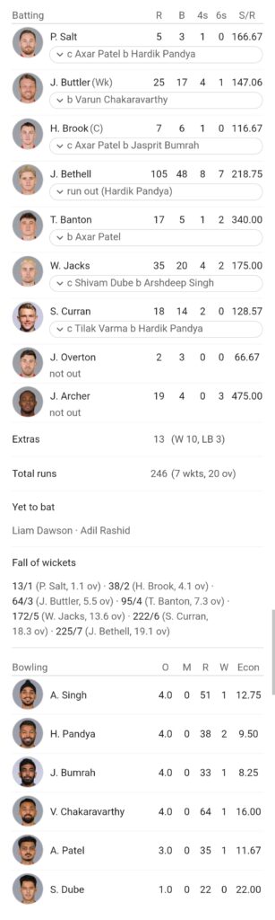 भारतीय टीम की ओर से संजू सैमसन ने 89 रन की पारी खेली। जबकि शिवम दुबे ने 43 रन बनाए। ईशान किशन ने 39, हार्दिक पंड्या ने 27 और तिलक वर्मा ने 21 रन का योगदान दिया। इंग्लैंड से विल जैक्स और आदिल रशीद ने 2-2 विकेट झटके। एक विकेट जोफ्रा आर्चर को मिला। 2 बैटर्स रनआउट हुए ।