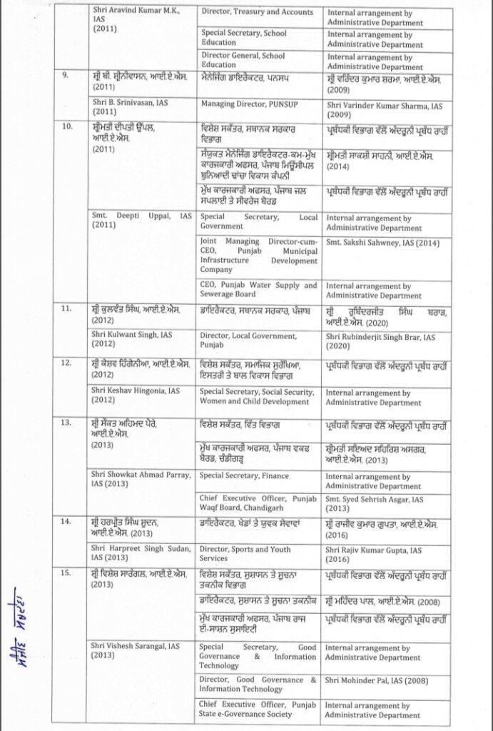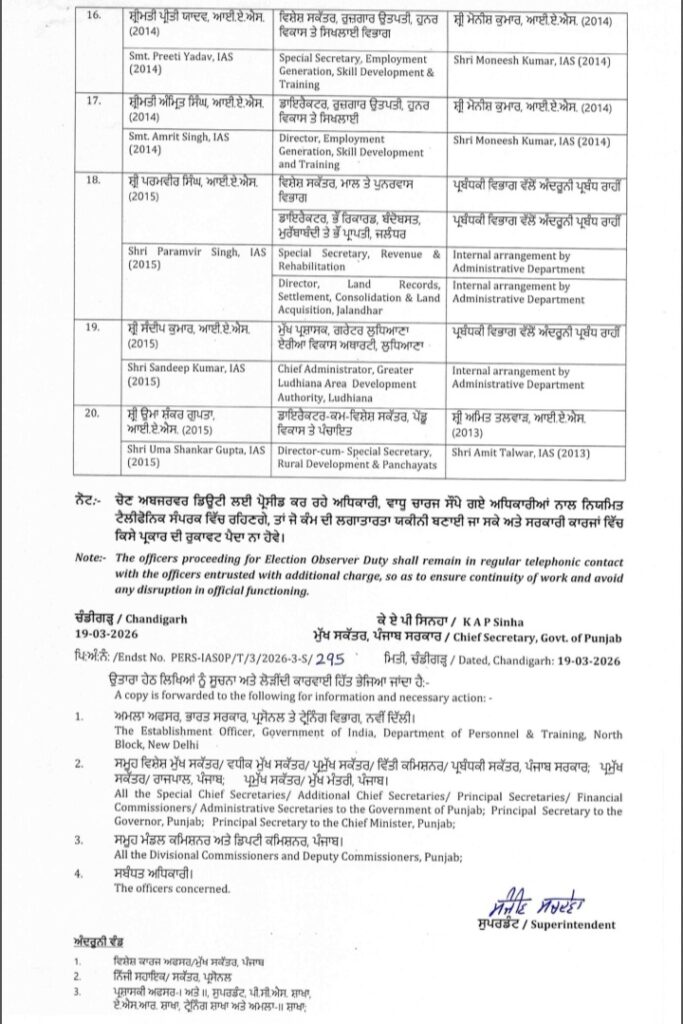 अमृतसर, 19 मार्च (राजन): देश में राज्यों में घोषित किए गए विधानसभा चुनाव को लेकर पंजाब में तैनात आईएएस अधिकारियों को चुनाव कमीशन द्वारा अलग-अलग राज्यों में चुनाव आब्जर्वर नियुक्त किया गया है। जिन-जिन आईएएस अधिकारियों की विधानसभा चुनाव में ड्युटिया लगाई गई है, उन उन आईएएस अधिकारियों के विभागों का चार्ज अन्य आईएएस अधिकारियों को दिया गया है। पंजाब सरकार ने 20 आईएएस अधिकारियों को उनके मौजूदा विभाग के साथ-साथ यह विभाग भी दिए गए हैं।