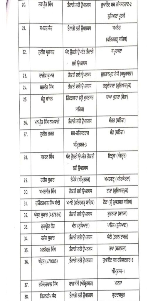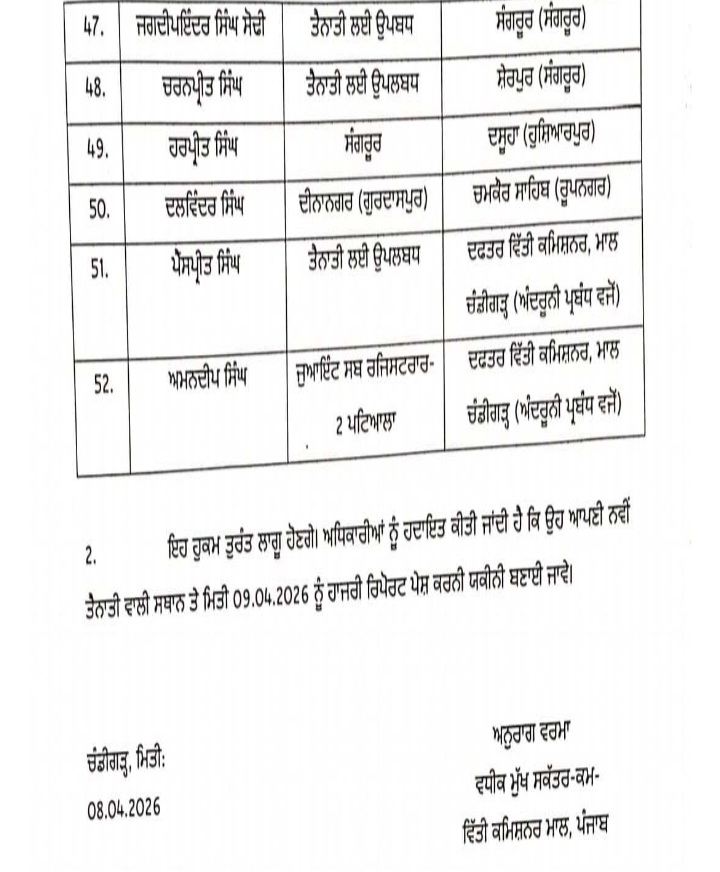 अमृतसर, 8 अप्रैल: पंजाब सरकार ने आज बड़े स्तर पर प्रशासनिक फेरबदल करते हुए 22 तहसीलदार व 52 नायब तहसीलदारों के तबादले कर दिए गए हैं।